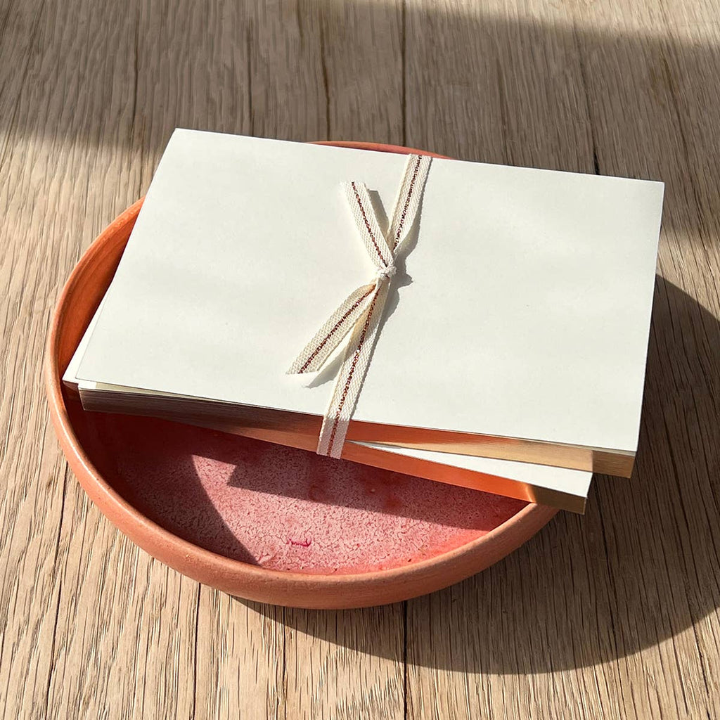 An all-seasons understated staple. Set of 2 tied with luxurious Italian pure cotton ribbon shot with rose gold metallic thread from our friends at Studio Carta. Perfectly sized, these notebooks are ideal for slipping into a purse or large pocket when you need to jot something down. Their design is understated but polished enough to pull out in meetings.